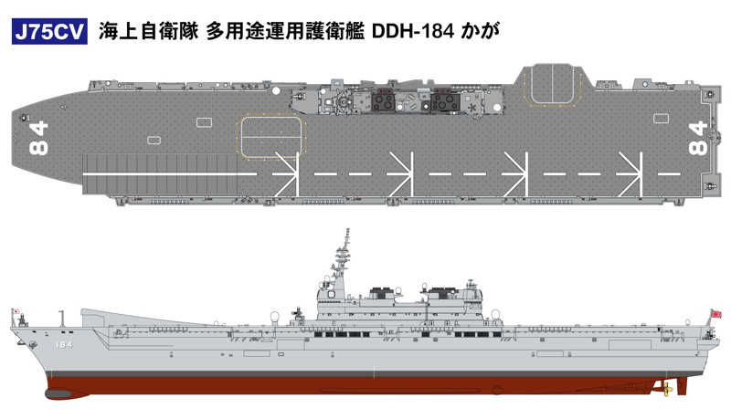 昨年、空母化構想が注目を集めた「いずも」型護衛艦を、現実よりも一足早く空母化するキットです。製品は空母化のためのスキージャンプ甲板パーツを新規金型にて追加しました。