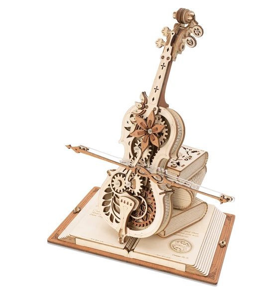 全体的にはロマンチックでレトロな雰囲気が漂い、主にチェロと魔法の本から構成されています。透かし彫りのボディ部分は内部の歯車をクリアに展示し、花びらの六枚付く花がチェロを引き立たせます。胴体にはヨーロッパ風の模様が刻まれ、非常にレトロで美しい雰囲気を醸し出しています。また、魔法ブック、小さな魔女、猫などのマジック要素がたくさん取り入れられています。さらに、魔法ブックの形をした台座には「20世紀最大のチェリスト」とされるパブロ・カザルスのストーリーが刻まれて、本体のチェロに重厚感を添えます。ご注意: